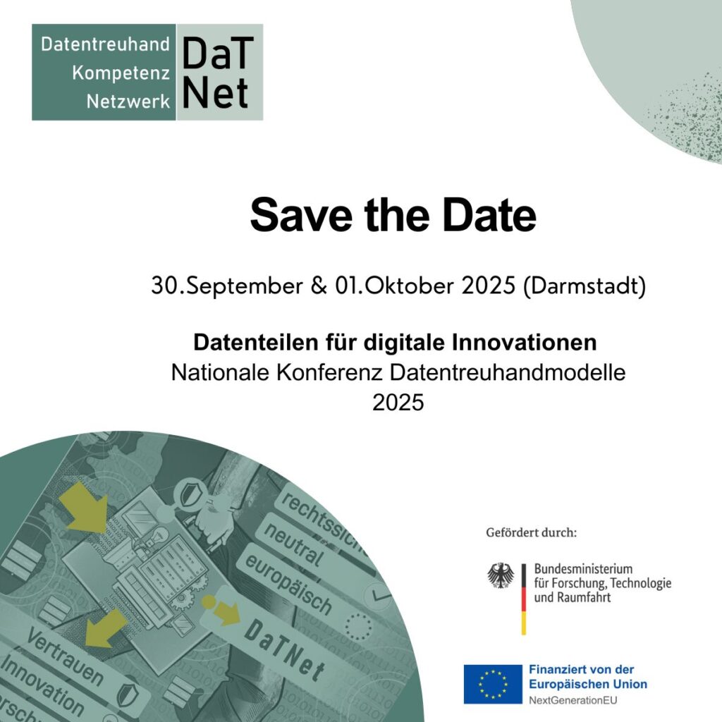 Das DatenTreuhand-Kompetenznetzwerk DaTNet steht für Bereitstellung von Informationen, Vermittlung von Kompetenzen und Ermöglichung von Erfahrungsaustausch zu für Datentreuhandinitiativen wesentlichen Themen wie Recht, Technik, Organisatorisches, Geschäftsmodelle sowie zu Fragen des politischen Rahmens. Zudem fördern wir die Vernetzung bestehender Datentreuhandinitiativen und freuen uns, Sie vor diesem Hintergrund auf die Nationale Konferenz Datentreuhandmodelle 2025 aufmerksam machen zu dürfen: